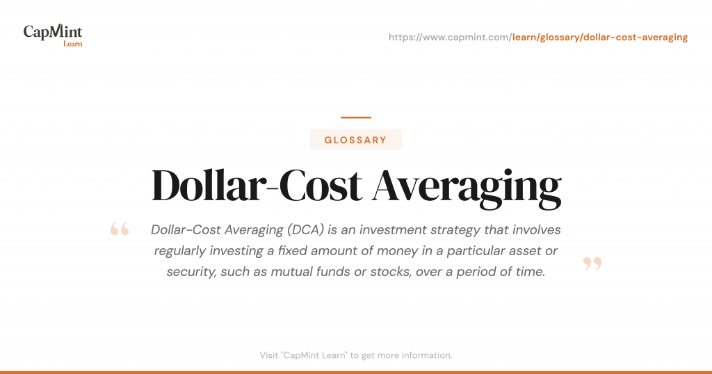 Dollar-Cost Averaging (DCA) is an investment strategy that involves regularly investing a fixed amount of money in a particular asset or security, such as mutual funds or stocks, over a period of time.