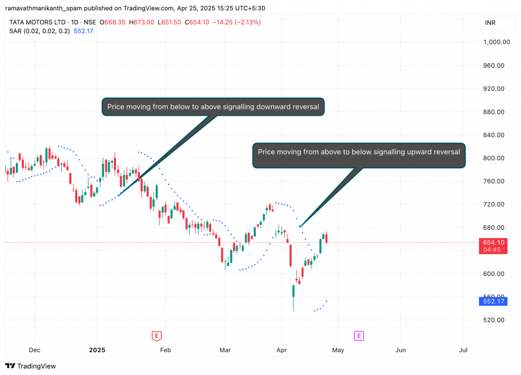Parabolic SAR dots show trend direction and potential reversals. Dots below price indicate an uptrend, while dots above the price suggest a downtrend. A flip in dots signals a possible trend change.